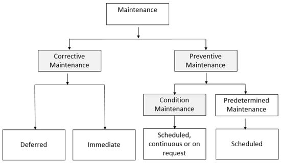 The most common troubleshooting process in maintenance includes identifying faults and where machine failures occur, analyzing faults, defining cause relationships, defining goals, and planning resources to eliminate and prevent faults [8]. Maintenance is the combination of all practical, managerial, and administrative activities throughout the life cycle of an installation to maintain or restore it to a state in which it can perform its required function. It is also defined as all the necessary and essential activities that are required to maintain a system throughout its life cycle in an operational and functional state or to restore it to a state in which it can perform its intended function [9,10]. The importance of the maintenance function has increased over time due to its role and impact on the rest of the working environment in the organization, i.e., by improving product quality and machine availability. Effective maintenance contributes to increased value through more profitable use of resources, improved product quality, and reduced rework and scrap [11]. The maintenance is categorized into two main areas, i.e., preventive maintenance, which includes all planned maintenance activities such as condition monitoring and periodic inspection, while corrective maintenance has to do with all unplanned maintenance activities to restore failure (Figure 1).