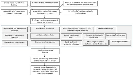 The presented contribution deals with the research of the maintenance strategy and procedures for improving maintenance processes in order to increase the efficiency and quality of the production system. It is based on a thorough analysis of the research of the available literary sources published in foreign and domestic scientific journals. The subsequent proposal includes defining new goals and maintenance performance indicators relevant to today’s production systems to track improvements in the sustainable development of the production system. There are also basic principles of the maintenance strategy with links to the production system and the choice of strategy for the organization. This paper emphasizes the audit of maintenance management and the implementation of quality in maintenance. Next, a new procedure for changing the maintenance strategy is described. This process includes reviewing the criticality of machines and equipment and their structural units, then resource and capacity planning and inputs for maintenance management, and the impact of maintenance on the operating costs of the production system. This was based on which partial projects in companies were verified—automotive industry (spare parts, preventive maintenance, planned maintenance, RCFA, TPM), rubber industry (quality, production efficiency), pharmaceutical industry (preventive and predictive maintenance), engineering industry (TPM, LOTO, RCM). The overall verification of the creation of the maintenance strategy and the proposed methodology was carried out on the basis of the outputs of the sub-projects and overall projects in the following companies with positive results—glass industry, chemical industry, and operational research (research and development of equipment for non-reactor parts of nuclear power plants). Ten steps of the audit of the current state of the management of maintenance processes were proposed, to ensure economic improvements in the costs of maintenance processes and operating costs, ensuring competitiveness. A methodology for changing the maintenance strategy focused on the efficiency, quality, and costs of the production system was proposed. The average benefits from the implementation of strategy changes in organizations reached at least the following: (1) increase in production efficiency—OEE (7%), (2) improvement in production quality (20%), (3) improvement in performance (15%), and (4) reduction in maintenance process costs (10%) in implemented projects.