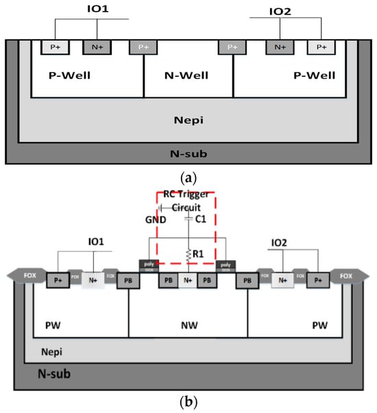 To overcome the drawback above, STDDSCR is proposed in this paper, as shown in Figure 1b: It has a P-type trap with P+ and N+ active regions at each of the IO1 and IO2 ends, and an N-type trap region in the middle. The high-concentration P+ injection spanning between the trap region and the circular PB injection in the N-type trap region constitutes a pair of PMOS. A hole is opened in the center of the circular PB injection of N+ injection, which is connected to an N-type trap region. Different from the static breakdown characteristics of the avalanche breakdown, the STDDSCR structure employs an RC trigger circuit to further reduce the trigger voltage. By detecting the capacitor charging during the ESD pulse, the voltage at both ends of the capacitor gradually rises to generate a voltage difference at the gate source of the PMOS, thereby enabling the PMOS to be turned on and provide the conduction current for the SCR device. Consequently, the STDDSCR structure can be activated in advance without a large ESD pulse voltage, reducing the trigger voltage. A wire is connected to the N+ injection region of the N-well to the RC resistive coupling circuit and the gate side of the PMOS to assist in device triggering [,].