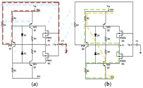 As the pulse voltage increases, the channel current is unable to meet the requirements, then the PN junction of Q3 has an avalanche breakdown, and the SCR positive feedback path formed by PNP and NPN transistor is used as the main current conduction path to release current [,]. This is shown by the yellow line in Figure 2b.