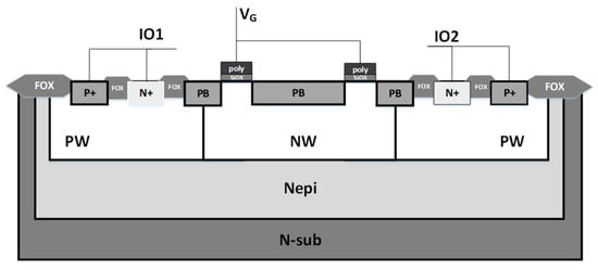 The conventional LTDDSCR is shown in Figure 1a: since DDSCR is symmetric, it has the same positive and negative ESD pulse paths. The conventional LTDDSCR optimizes the trigger voltage by changing the avalanche breakdown position of a P+ trigger junction spanned between the trap regions. When the ESD pulses reach the IO1 port, the ESD conduction path is formed through the NPN and PNP with mutual positive feedback. However, the trigger voltage is not able to be further reduced because of avalanche breakdown mechanism.