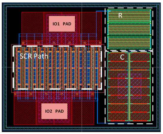 In order to facilitate the simulation and analysis of STDDSCR structure in TCAD, the gate voltage of the PMOS pair was fixed, as shown in Figure 3. Figure 4 shows the overall version of the structure. The SCR layout uses inserted finger distribution, where the resistance consists of the square kΩ/□ resistor and the capacitor is a two-layer metal MOS capacitor. The metal layer below the PAD connects to the RC trigger circuit, and the metal layer above the PAD is connected to the IO port. The structure is biaxially symmetrical, allowing the ESD current to be discharged simultaneously from both sides of the finger bar.