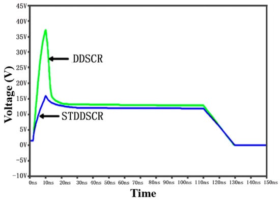 Voltage at both ends of DDSCR and STDDSCR structures.