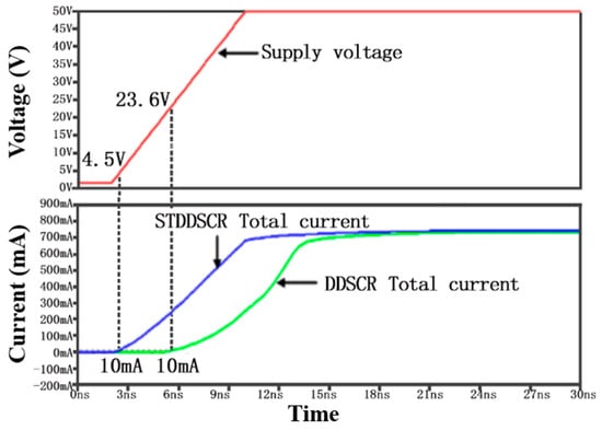 LTspice simulation was performed for the extracted STDDSCR circuit diagram. To verify that the external RC trigger circuit achieves trigger voltage reduction, a TLP pulse voltage with a rising edge of 10 ns, a duration of 100 ns, a voltage of 50 V, and an internal resistance of 50 Ω was applied to the IO1 ends of the conventional DDSCR and STDDSCR structures, respectively. Figure 5 shows the variation of the voltage across the IO ports when a pulse was applied. With the increase in the pulse voltage, the voltage between IO port of STDDSCR structure is much lower than DDSCR at the same time, indicating that the RC trigger circuit achieves a further reduction in the trigger voltage. Figure 6 shows the total current versus supply voltage curves for the DDSCR and STDDSCR structures. Assuming that the device turns on when the total current in the circuit reaches 10 mA, we can know that when the device is on, the trigger voltage of the STDDSCR structure and DDSCR is 4.5 V and 23.6 V, respectively. The current curve shows that the STDDSCR has a lower trigger voltage compared to the DDSCR.