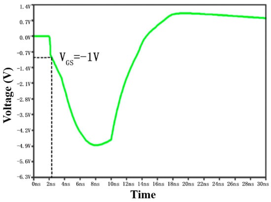 The working principle of the device is further explored by TCAD software (Sentaurus TCAD). The threshold voltage of PMOS in STDDSCR structure is set to −0.8 V. Figure 7 shows the gate-source voltage of PMOS varies with time. In order to verify the effect of trigger junction on reducing trigger voltage in TCAD simulation, the fixed gate-source voltage was taken, at which time the PMOS starts to conduct. Figure 8 shows the I–V curves of the three structures under the same process simulation conditions. As we expected, the LTDDSCR trigger voltage of P-type trigger junction is lower than that of traditional DDSCR, and the STDDSCR structure further reduces the trigger voltage. Therefore, the simulation results show that two trigger units in the STDDSCR structure can effectively reduce the trigger voltage.