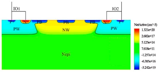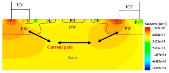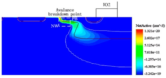 The avalanche breakdown of the device occurs at the PB injection of the IO2 port, where the PB injection acts as a trigger junction and changes the location of the avalanche breakdown. For the PMOS in the device, Figure 12 shows the image of the cavity current at the PMOS channel when the gate source voltage is −1 V. There is a conductive channel under the PMOS, which provides channel current to facilitate the conduction of the SCR loop.