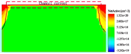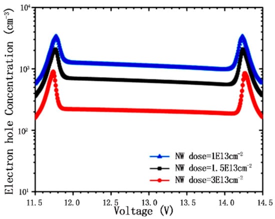 Formulas (3) and (4) indicate that the change in N-well injection concentration will change the trigger voltage and the threshold voltage of PMOS. As shown in Figure 14, the trigger voltage decreases as the N-well injection concentration increases. However, a greater concentration of NW injection is not always better. Figure 15 shows a variation curve of hole concentration under PMOS with different concentrations of N-well. Contrary to Figure 14, the hole concentration under PMOS decreases as the N-well injection concentration increases. This indicates that the threshold voltage of PMOS becomes larger due to the increase in , making channel-opening difficult [see (3) and (4)]. Therefore, the concentration of N-well injection needs to be strictly controlled.