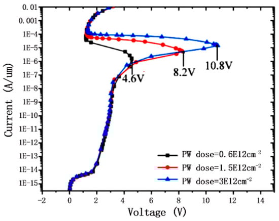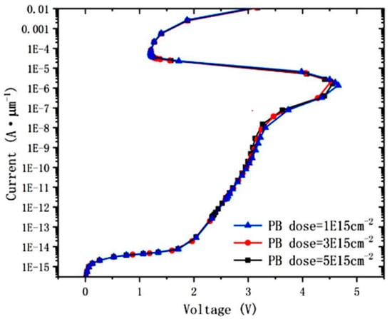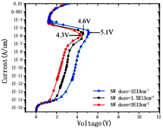 Figure 13 shows the I–V curves of different PB injection concentrations. As we can see, the trigger voltage hardly changes for different PB injection doses. This structure has a small leakage of 1E14 A/μm level at 1.5 V operation, but a large leakage at 3.3 V operation. Thus, it can be used for ESD protection of 1.5 V high-speed ports.