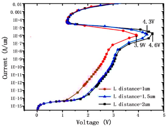 As the base of the NPN triode, the doping concentration of P-well is highly correlated with the transmission coefficient of the base region. Figure 16 shows the variation of the trigger voltage with different P-well injection concentrations. As shown in the figure, the increase in P-well injection concentration makes the NPN conduction difficult and the trigger voltage become higher. And when the PW injection dose is 0.6 × 1012 cm−2, a lower trigger voltage can be obtained. In the next test, the effect of the PMOS gate length on the trigger voltage was verified, as shown in Figure 17. Since the gate length directly determines the channel length of the PMOS, and the channel length affects the intensity of the channel current [see (5)], when the gate length L decreases, the conduction current provided to the SCR path becomes larger, and the trigger voltage of the device decreases. Note that the gate length should not be too short to avoid the PB injection region on both sides of the PMOS to be connected after annealing. Compared to the other two cases, the device with a length of 1μm starts to leak current at 1 V.