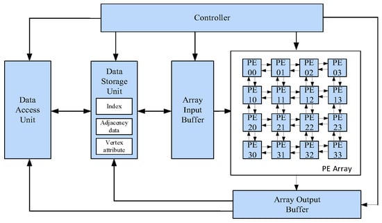 For graph computing, architectural innovation is imperative [11,12,13,14,15,16,17,18,19,20]. Reconfigurable graph computing accelerators combine the flexibility of software computing with the efficiency of hardware computing, which provide more efficient computational performance and improve upon the drawbacks of dedicated graph computing accelerators. They represent an effective approach to addressing the challenge of effectively handling diverse inputs in graph computing. GraphPulse [11] is an event-driven graph processing accelerator, which improves speed by optimizing event merging, prefetching, and stream scheduling. Polygraph [12] discussed the value of flexibility in graph computing accelerators, identified the classification of key algorithmic variants, and was able to modularly integrate the specialized features of each variant. TuNao [15] is a reconfigurable graph computing processor that aims to improve flexibility by exploring graph data locality and reducing off-chip memory accesses. DGRN [16] proposed a reconfigurable PE array composed of two heterogeneous PE units, namely aggregation PE and update PE, for aggregation and update operations under a unified architecture. Asiatici et al. [17] proposed a PE with efficient DMA data transmission, optimized data retrieval, and write operations, enabling efficient processing of graph algorithms. Hitgraph [18] achieved highly parallel execution by leveraging inter-partition and intra-partition parallelism to optimize algorithm execution.