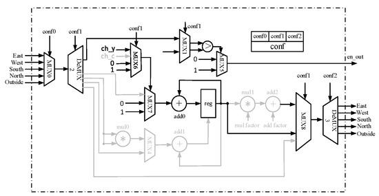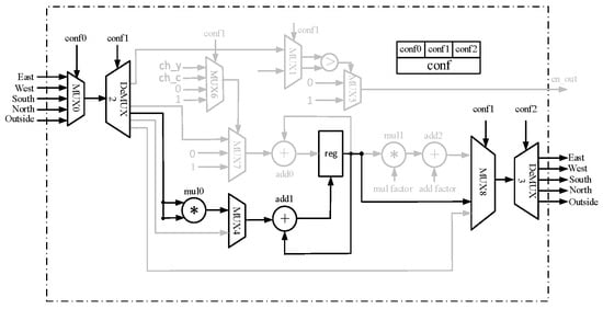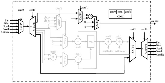 conf0 controls the source of input data. Through MUX0, the input data can be received from any of the four adjacent PEs located in the north, south, east, or west directions, or directly from an external input.
