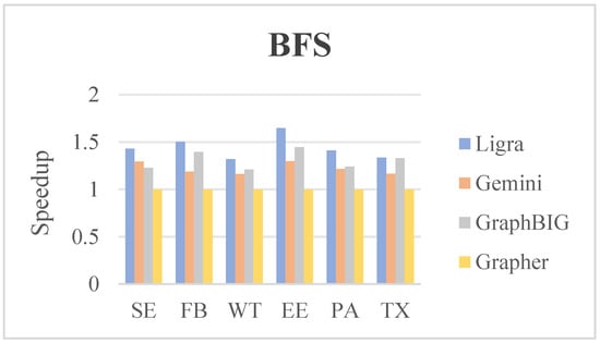 The time comparison between the three graph frameworks and Grapher’s execution of the BFS algorithm is shown in Figure 9, where Grapher processes the six datasets with a decrease of 24.23% to 39.31% relative to Ligra, 14.15% to 23.01% relative to Gemini, and 17.44% to 30.93% relative to GraphBIG.