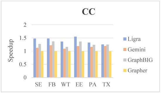The time comparison of the three graph frameworks with Grapher for executing the CC algorithm is shown in Figure 10, which shows that Grapher decreases from 20.24% to 35.43% with respect to Ligra, 8.30% to 18.03% with respect to Gemini, and 13.74% to 26.97% with respect to GraphBIG.
