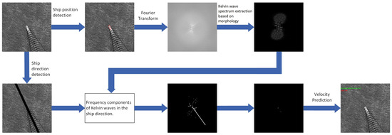 In the past few years, there has been relatively little research on predicting ship speed based on wakes in optical images. Instead, the recent studies have typically relied on large datasets constructed from non-image data points [4,5]. Against this backdrop, we propose a method for predicting ship speed using optical remote sensing images based on ship wakes.There are four main types of ship wakes: turbulent wakes [6], Kelvin wakes, narrow “V”-type Bragg wakes [7] and internal wave wakes [8], and the Kelvin wake [9] is one of the most detectable wakes in visible light remote sensing applications of ocean observations [10]. The Kelvin wake has obvious characteristics, and after analysis, the wavelength of the shear wave has a definite mathematical relationship with the velocity of the ship. Therefore, it is a good choice to use the Kelvin wake to analyze the velocity of the ship. This paper mainly studies ship velocity and heading analysis based on Kelvin wakes.