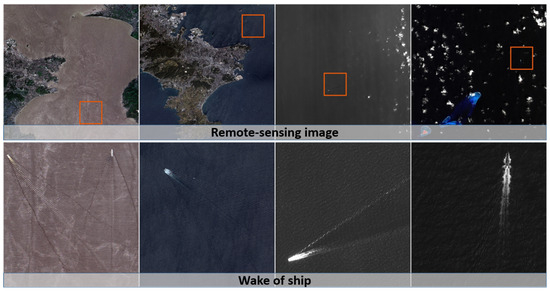 In images, ship wakes are the only motion features of ships, but there is currently no public dataset showing the correspondence between ship wakes and ship velocity. Therefore, this paper uses the optical remote sensing image and the corresponding automatic identification system (AIS) data to construct a ship Kelvin wake dataset with real velocity and real heading, namely, the optical ship velocity dataset (OSVD). The OSVD is derived from large-scale, high-resolution panchromatic and multispectral images obtained by the Jilin-1 push-sweep. First, ships with Kelvin wakes were selected from 61 ultrahigh-resolution remote sensing images (Figure 2 is an example of the above selection). In addition, through rigorous data cleaning, we processed the large amount of AIS data obtained, including removing duplicate entries, filtering out anomalies in speed and heading [21] and eliminating data with abnormal positions [22], ultimately resulting in high-quality and reliable AIS data. According to the shooting time and area information of the remote sensing image, the cleaned AIS point data were retrieved and superimposed into the image. Then, the longitude, latitude, size and heading of the target ship are sorted and matched with the AIS point data. Finally, the velocity information of the target ship corresponding to the AIS is extracted and arranged in the real label of the dataset. The distribution of ship targets in marine scenes is sparse, which makes it difficult to find ships with obvious wakes. Finally, the OSVD constructed in this paper contains 61 optical remote sensing images.