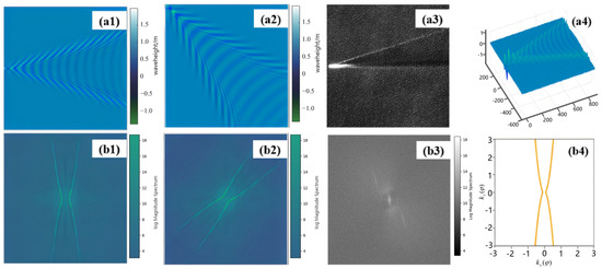 Comparison of simulated Kelvin wakes and real Kelvin wakes. (a1) Simulated Kelvin wake, m/s, ; (b1) 2D spectra of (a1); (a2) Simulated Kelvin wake, m/s, ; (b2) 2D spectra of (a2); (a3) Real Kelvin wake; (b3) 2D spectra of (a3); (a4) 3D simulation modeling of Kelvin wake; (b4) Drawing Kelvin wake elevation spectrum curve according to the formula.