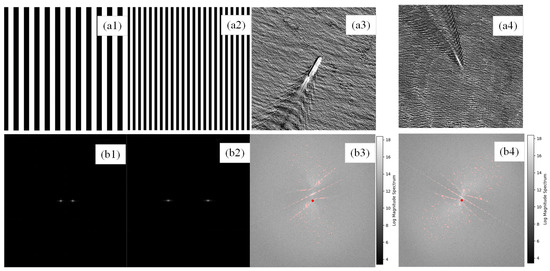Spectral image distribution of different frequencies. (a1) Low−frequency sine wave; (b1) 2D spectra of (a1); (a2) High−frequency sine wave; (b2) 2D spectra of (a2); (a3) Real Kelvin wake, m/s; (b3) 2D spectra of (a3); (a4) Real Kelvin wake, m/s; (b4) 2D spectra of (a4).