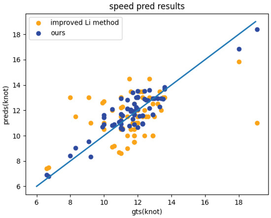 Figure 5 shows part of the analysis results of Ship-VNet on the homemade dataset OSVD. In the quantitative accuracy test, we compare the ship velocity analyzed by Ship-VNet with the AIS data. Compared with the AIS data, the ship velocity MAPE analyzed by Ship-VNet is 6.07%, which means that the accuracy of Ship-VNet is 93.93%. Figure 6 is the scatter plot of the predicted ship velocity and real AIS velocity obtained by Li’s method and Ship-VNet.