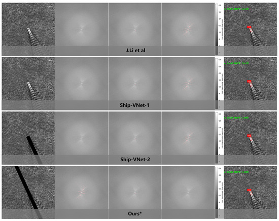 To verify the advantages of Ship-VNet, a comparative experiment was conducted using the OSVD dataset constructed in this paper. However, there are very few studies on the use of optical remote sensing images to analyze the velocity of ships, so this paper only compares the method of Li et al. [20], which also uses the Kelvin wake spectrum to analyze the velocity of ships. Li et al. [20] constructed a simulated Kelvin wake wave hyperspectral curve in the frequency domain according to the relationship between the derived Kelvin wake elevation spectrum curve and the ship’s direction and velocity. The numerical range of the ship’s direction and velocity is given in advance, and through the defined matching matrix, the maximum value fitting of the simulated curve and the Kelvin wake spectrum is performed to estimate the ship’s velocity. Unlike the simulated Kelvin wake, which has clear frequency domain features, the real optical remote sensing image contains considerable sea surface noise [28], resulting in more low-frequency redundant information after converting the frequency domain. Therefore, the ship’s heading extracted by Li et al.’s [20] method in the frequency domain has a large error, which makes it difficult to fit the simulated Kelvin wake wave hyperspectral curve constructed by this method with the real wake spectrum in the frequency domain. In contrast, Ship-VNet uses a variety of threshold filtering methods to directly process the frequency domain of optical remote sensing images, and combined with the ship heading detected by the ship target, the position of the Kelvin wake wave hyperspectral curve can be more accurately located. In Table 1, the results of Ship-VNet and Li et al.’s [20] method and the method of unmasked turbulent wakes in the OSVD dataset are shown. Experiments show that Ship-VNet reduces the MAPE by 6.32% compared with the method of Li et al. [20]. Compared with Ship-VNet-1, which does not mask the turbulent wake, the MAPE is reduced by 4.75% in OSVD, and the effect is significantly improved. Figure 7 shows the results of different methods on the same image.