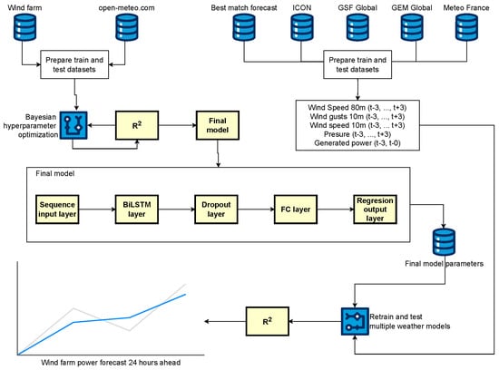 Following the initial phase of training and testing, the Bayesian optimization process helped us choose the most appropriate hyperparameters, which further improved our approach. Subsequently, the model was re-trained and re-tested using the aforementioned parameters to achieve optimal accuracy. The final stage of our study facilitated the evaluation of the improved efficacy of the BiLSTM model through a meticulous calibration of hyperparameters. In addition, it allowed us to identify the optimal weather forecast model for wind power generation. This forecast model schema is presented in Figure 1.