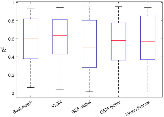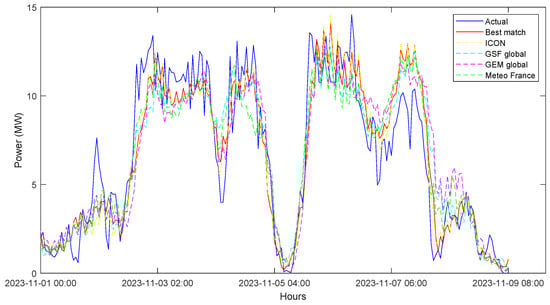 Subsequently, the BiLSTM model was trained and validated using a variety of weather prediction models (ICON, GEM Global, Meteo France, GSF Global, and Best Match []) as input with the best hyperparameters generated previously. With the same input intervals, the validation intervals and features of different weather prediction models were applied.