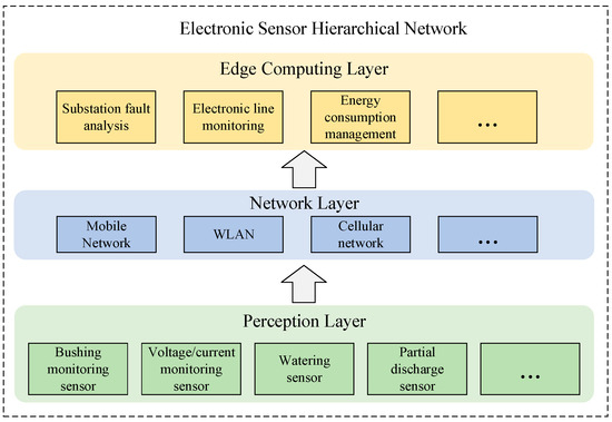 The electrical sensor network system is divided into three parts: the perception layer, the network layer, and the edge computing layer. The perception layer includes the bushing monitoring sensor, voltage/current monitoring sensor, watering sensor, partial discharge sensor, on-load tap-changer monitoring sensor, etc. The network layer encompasses the mobile network, wireless local area network (WLAN), and cellular network, providing the requisite network technology for the electrical sensor network system. The communication process must comply with the protocols of wireless LAN authentication and privacy infrastructure (WAPI), as well as the micro-power wireless network communication protocol for the internet for power transmission and transformation equipment (Q/GDW). The edge computing layer pertains to the application of the electrical sensor network, including for substation fault analysis, electronic line monitoring, and energy consumption management.
