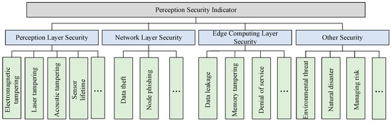 Based on the hierarchical electrical sensor network model, the AHP method is employed to analyze the security of the electronic sensors and sensor network, and a hierarchical perception security architecture is constructed. The AHP provides a structured and systematic approach to decision making by decomposing the complex security assessment problem of the electrical sensors and sensor network into hierarchy sub-problems. The AHP uses pairwise comparisons to determine the relative importance of any security attack, has the ability to handle mixed attributes, is robust, and can perform comprehensive evaluation. The establishment of the hierarchical perception security architecture considers factors from the perception layer, the network layer, and the edge computing layer, as illustrated in Figure 2.