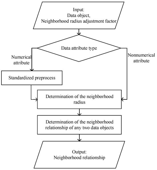 The subsequent processing of numerical and nonnumerical attributes is different. The numerical attribute values should be normalized, the distance between the different data objects in the numerical attribute can be calculated by the Euclidean distance formula, and the neighborhood radius of the numerical attribute can be defined as a number that depends on the variance and mean of the numerical attribute. However, the distance in the nonnumerical attribute is equal to 1 when the data objects are the same; otherwise, the distance is equal to 0. Based on this, the neighborhood radius of the nonnumerical attribute is defined 0.