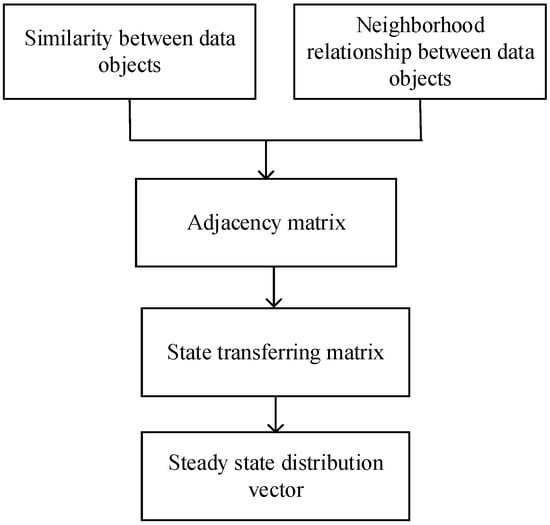 The similarity between two nodes is used to customize the state-transferring probability matrix of the Markov random wandering process, which can effectively and accurately complete the transferring process between nodes. According to this mechanism, nodes that tend to be outliers have a smaller probability of being visited. When the Markov random wandering process reaches a steady state after a certain number of iterations, each element in the steady-state distribution vector can represent the probability of the random wanderer staying at each node, i.e., the importance of each node. The larger the value of the steady-state distribution vector is, the smaller the probability of converging to an outlier. In order to distinguish the importance of each node, we standardize the importance values in the steady-state distribution vector. The standardized importance value of is denoted as , which is defined as follows: