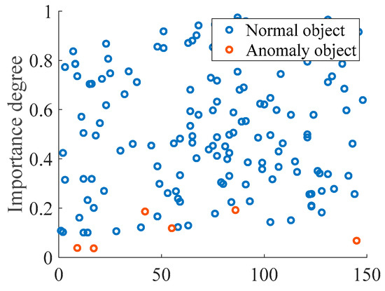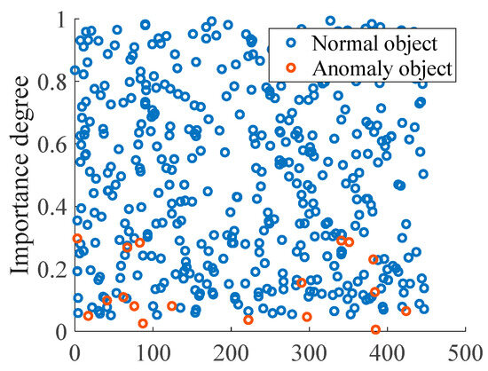 According to the hierarchical perception security architecture in Figure 2, a dataset was constructed that contained 450 data objects, including 430 normal objects and 20 anomaly objects. The results of the proposed method examined by the constructed dataset are shown in Figure 6. In the detection results, there are two outliers that were not detected, but the detection results also verify that the anomaly objects have small values of importance degree.