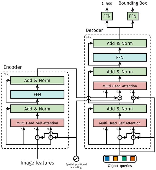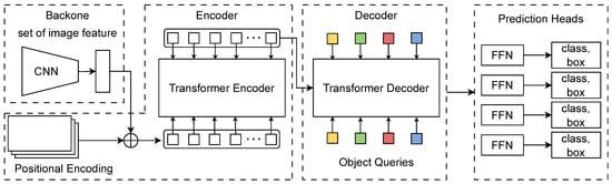 DETR (Detection Transformer) is a target detection model based on the transformer architecture that views target detection as a direct set prediction problem [44]. Unlike traditional methods based on anchors and region proposal networks, DETR uses a novel bipartite matching loss function and end-to-end training approach, thereby avoiding complex post-processing steps such as non-maximum suppression. This model processes the entire image with a set of object queries through its transformer encoder–decoder structure, directly predicting the category and bounding box of all objects in parallel. The transformer architecture adopted by DETR is shown in Figure 6.