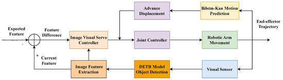 This study primarily investigates advanced object detection and time series prediction methods in image-based visual servoing systems, aiming to capture targets better and predict the motion trajectory of robotic arms in advance, thereby enhancing the system’s performance and reliability. The research first implements object detection on the VOC2007 dataset using the Detection Transformer (DETR) and achieves ideal detection scores. The particle swarm optimization algorithm and 3-5-3 polynomial interpolation methods were utilized for trajectory planning, creating a unique dataset through simulation. This dataset contains randomly generated trajectories within the workspace, fully simulating actual working conditions. Significantly, the Bidirectional Long Short-Term Memory (BILSTM) model was improved by substituting its traditional Multilayer Perceptron (MLP) components with Kolmogorov–Arnold Networks (KANs). KANs, inspired by the K-A theorem, improve the network representation ability by placing learnable activation functions on fixed node activation functions. By implementing KANs, the model enhances parameter efficiency and interpretability, thus addressing the typical challenges of MLPs, such as the high parameter count and lack of transparency. The experiments achieved favorable predictive results, indicating that the KAN not only reduces the complexity of the model but also improves learning efficiency and prediction accuracy in dynamic visual servoing environments. Finally, Gazebo software was used in ROS to model and simulate the robotic arm, verify the effectiveness of the algorithm, and achieve visual servoing.