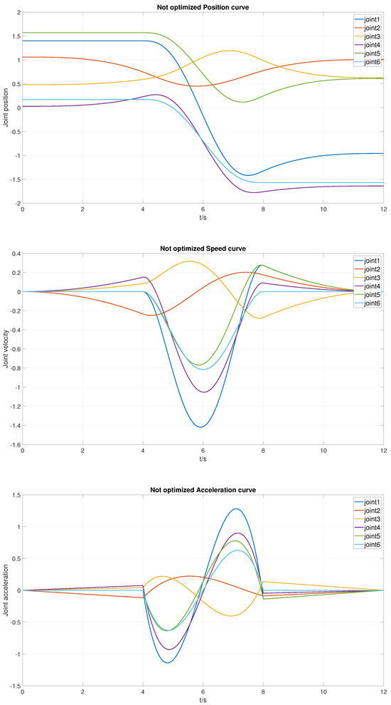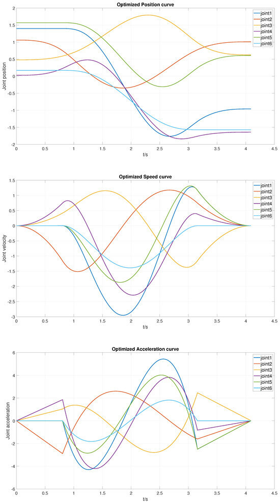 The authors in [45] proposed the 3-5-3 trajectory planning method. First, the trajectory from the starting point to the first midpoint is planned using a third-order polynomial; second, the trajectory from the first point to the second midpoint is planned using a fifth-order polynomial; third, the trajectory from the second midpoint to the endpoint is planned using a third-order polynomial. During the planning process, the velocities and accelerations at the connection points remain continuous.