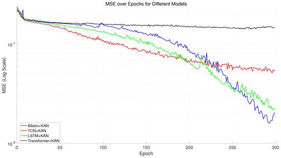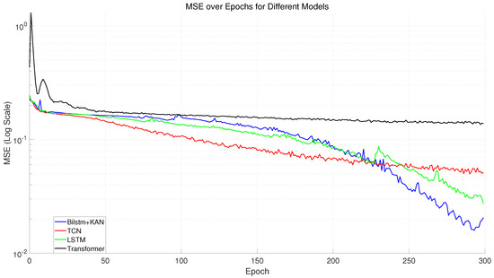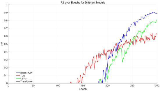 Next, observing the trend in , the model exhibits initial instability. values are extremely low at the beginning of training, with several significant fluctuations, possibly due to suboptimal model parameter initialization or initial adaptation issues with the training data distribution. By the 150th epoch, the value continues to increase and stabilizes at above 0.9 by the end of training, demonstrating that the model can explain the majority of variance in the data, showing excellent predictive power. After comparing the performance of the BILSTM+KAN model with other models (TCN, LSTM, transformer) as shown in Figure 41, we found that the BILSTM+KAN model demonstrated significant advantages. Firstly, the BILSTM+KAN model exhibited a rapid convergence speed in the early stages of training, with MSE quickly decreasing, showcasing its strong learning capability. Additionally, the score of this model rose rapidly during training, eventually approaching 1, indicating that it achieved an excellent fit to the task and could effectively explain the variability in the data as shown in Figure 42. In contrast, the other models did not perform as well in terms of MSE and , especially the transformer model, which had higher MSE and lower scores.