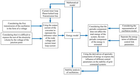 The time effect of the oscillation from the junction point to the converter in the form of voltage and electricity—when the oscillation is excited due to a fault at the junction point, and then to the output current and voltage of the converter—is ignored in this paper’s construction of an energy model that is capable of characterizing the oscillation modes. Therefore, our future research work will take into account the influence of the time effect of the oscillation transfer on the oscillation stability of the grid-connected system; additionally, we aim to put forward a model of an active damping technology to suppress the oscillation, given that this is the key link that affects the stability of the grid-connected system.