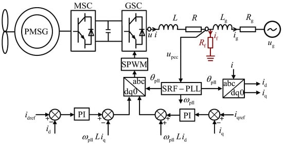 There are many inducing factors for direct-driven wind turbines with LVRT. In this paper, the most common three-phase short-circuit fault through transition resistance is taken as an example to analyze. The control framework of a typical grid-connected direct-drive wind power system is depicted in Figure 2.