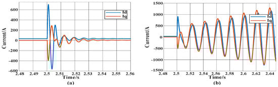 In Figure 2, and are the line impedance from the converter port of the direct-driven wind turbine to the junction point. and are the line impedance from the junction point to the power grid. The short-circuit fault of the three-phase transition resistance occurs at the junction point, and the transition resistance is and the short-circuit current is . and are the output angular frequency and phase angle of the PLL, respectively; and are the feedforward compensation terms of the current inner loop. , , , , and represent the converter port voltage, output current, junction voltage, grid-connected current, and grid voltage of direct-driven wind turbines, respectively. Subscript d and q correspond to the electrical volume in the rotating coordinate system of d-q, and subscript “ref” is the command value of the corresponding electrical volume.