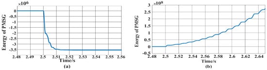 It can be seen from Equation (22) that energy is related to the change of voltage and current. To further analyze the energy expression, Equations (13), (14) and (16) are substituted into Equation (22), and it is considered that the value accumulated at the moment of axial junction voltage is equal to , while the voltage at the moment of the junction point changes instantaneously. Therefore, is used as a substitute to represent the instantaneous change of the voltage of the axis junction point, and the rest of the sudden change of electricity consumption is also replaced; the expression of the change of the total energy of the final direct-driven wind turbine is as follows: