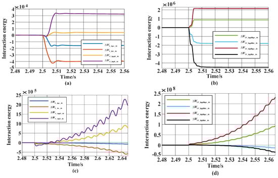 As shown in Figure 6 and Figure 7, the non-periodic energies in the inner current loops of and show a decreasing trend, regardless of the oscillatory convergence condition or the oscillatory divergence condition, which helps to reduce the total energy of direct-driven wind turbines and is conducive to the stability of the grid connection system. The non-periodic energies of PLL energies and show increasing trends, helping to increase the total energy of direct-driven wind turbines, which is not conducive to the stability of grid-connected systems. The current inner loop–phase-locked loop interaction aperiodic energies and show a decreasing trend, helping to reduce the total energy of direct-driven wind turbines, conducive to the stability of the grid-connected system; and show an increasing trend, helping to increase the total energy of direct-driven wind turbines is not conducive to the stability of the grid-connected system. By comparing Figure 6a with Figure 6c, we can see that the aperiodic energy derivatives of the current inner loop and PLL under the oscillating divergence condition are larger than those under the oscillating convergence condition. Similarly, the aperiodic energy derivatives of the current inner loop and PLL interaction are also found by comparing Figure 6b with Figure 6d. Therefore, the absolute value of the energy derivative can be used to characterize the influence of the energy interaction path on the stability of the grid-connected system. By further comparing Figure 6c with Figure 6d, it can be seen that , ; therefore, it can be determined that the key factor affecting the stability of the grid-connected system is the interaction energy of the current inner loop and phase-locked loop, and the interaction link of the current inner loop and phase-locked loop is the key link affecting the stability of the grid-connected system. In summary, the simulation analysis is consistent with the above analysis of the influence of the stability of the direct-driven wind-powered grid-connected system, which verifies the effectiveness of the stability analysis method proposed in this paper.