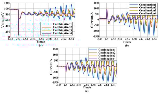 As shown in Figure 8, these four combinations cover the range from the divergence to the convergence of the oscillations. By comparing the change trajectory of combination 1 and combination 2 in Figure 8, it can be seen that increasing the current loop integral parameter from 4.84 to 6.42 is conducive to the oscillation stability of the direct-driven wind-powered grid-connected system. Comparing combination 2 and combination 3, it can be seen that the oscillation stability of the grid-connected system is improved by reducing the proportion parameter from 9.45 to 6.3 and the integral parameter from 50.25 to 40.2 in the PLL control parameters. Comparing combination 3 and combination 4, it can be seen that increasing the current loop ratio parameter from 1.32 to 5.25 is conducive to the oscillation stability of the grid-connected system, which is consistent with the above stability analysis conclusion.