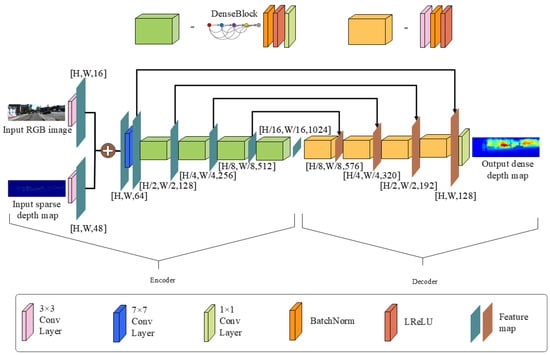 The encoder section consists of multiple convolutional and pooling layers, responsible for processing the input RGB image data and sparse depth maps. It conducts feature fusion and multi-scale feature extraction to abstract both low-level and high-level features from the input data, encoding them into higher-level representations for decoder utilization. The decoder section comprises multiple upsampling blocks and operations for feature fusion, gradually restoring the size and feature details of the feature maps. It decodes the feature maps extracted by the encoder into outputs of the same size as the original input data, ultimately generating predictions or reconstructions matching the original input data.