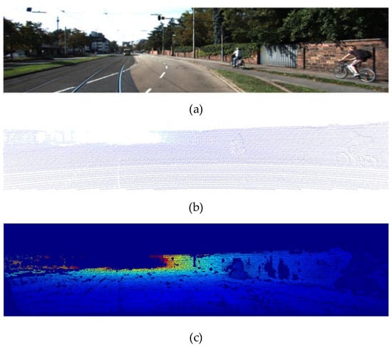 Example plot of KITTI dataset. (a) RGB Image, (b) Sparse depth map (white background), (c) Semi-dense map (pseudo-color background).