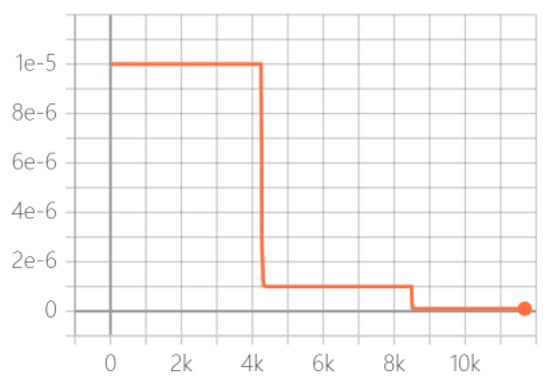 In the experiments conducted in this paper, the network architectures were trained for 11 epochs. The initial learning rate was set to 0.001, and every five epochs, the learning rate was decayed by a factor of 0.1. To optimize the adjustment of the learning rate, the Adam optimizer was employed. This setup allowed the network to adaptively adjust the learning rate based on the training progress. The variation in the learning rate during the training of the proposed network architecture is depicted in Figure 5, which was automatically generated by the Tensorboard tool. In the graph, the horizontal axis represents the number of training data samples, while the vertical axis represents the learning rate.