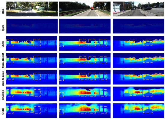 As shown in Figure 6, three examples are selected for comparison with each network, with distinct differences highlighted by yellow dashed boxes. The CSPN and Spade-RGBsD methods fail to adequately display details of objects slightly further away. Particularly evident in the third example, the edges of the car approaching from a distance are blurred in the depth maps generated by these two networks, making it difficult to discern the outline of the car. In contrast, the proposed network architecture renders the edges and contours of the car clearer, indicating better handling of details of distant objects. Sparse-to-Dense and GAENET excessively smooth the edges and details of objects. This is particularly noticeable in the second example, where the truck’s edges blend into the surrounding scene, obscuring the boundaries between the truck and the environment. In contrast, the proposed network architecture exhibits clearer delineation of the truck’s edges.