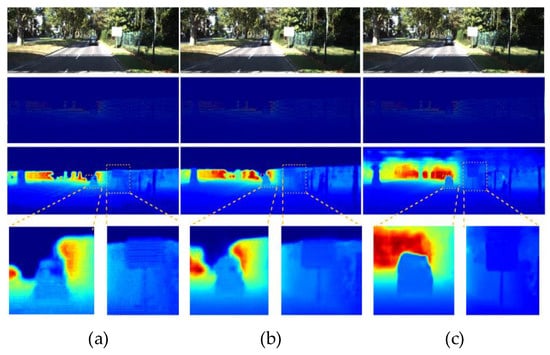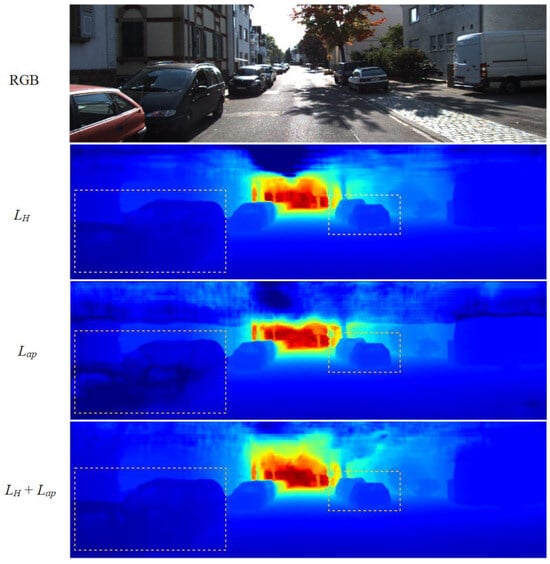 As shown in Figure 9, this study conducted a qualitative visualization comparison with LH and Lap in a single sample, highlighting the differences in more detail with yellow dashed-line boxes. Compared to the depth map obtained with the joint loss, the depth map trained solely with LH loss exhibited excessive smoothing effects in areas such as car windows and overlapping vehicles. On the other hand, the depth map trained solely with Lap loss showed severe ghosting issues in the overlapping parts of vehicles. Therefore, in the proposed model of this study, removing either loss function did not lead to better depth completion, highlighting the superiority of the proposed joint loss function.
