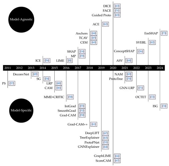 Figure 4 presents a timeline chart for the significant XAI methods proposed since 2011. Model-agnostic methods, such as Shapley values for explaining reinforcement learning (SVERL) [42], diverse counterfactual explanations (DICE) [43], Anchors [44], and testing with concept activation vectors (TCAV) [45], are displayed above the time axis, while model-specific methods, like class activation map (CAM) [46], deep learning important features (DeepLIFT) [47], and layer-wise relevance propagation (LRP) [48], are shown below. During the period from 2017 to 2020, significant growth in both categories is evident. Based on the number of citations, local interpretable model-agnostic explanations (LIME), Shapley additive explanations (SHAP), and Anchors are the most cited methods in the model-agnostic category. In the model-specific category, deconvolutional network (DeconvNet) [49], CAM, and GradCAM [50] are the most frequently cited. The explanation types include feature importance [14], rules [44], counterfactuals [51], saliency maps [52], prototypes [53], and concepts [45]. Moreover, it can be seen that several variations of gradient-based explanatory methods have been proposed, such as saliency gradient (SG) [54], integrated gradient (IntGrad) [55], smoothing gradient (SmoothGrad) [52], and gradient-weighted CAM (grad-CAM) [50]. These methods access the internal signals of the model to estimate the model’s decision process. The gradients are used to realize how the output responds to variations in the input. Perturbation-based explanation algorithms can also be identified, such as individual conditional expectation (ICE) [56], SHAP, LIME, and Anchors. They differ from gradient-based methods because they do not require access to the model’s internal parameters. Instead, they rely only on input–output pairs to analyze the model’s decision-making process. This characteristic makes them generally model-agnostic.