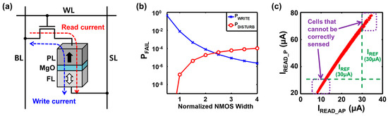 Second, there are difficulties in simultaneously improving the read–disturb margin and write-ability of STT-MRAM. Particularly, given that the read and write current paths of the STT-MRAM are the same, it is challenging to meet different requirements for read and write (Figure 1a). For example, increasing the width of the access transistor for reliable write operations inadvertently results in bit flips during read operations (Figure 1b). In addition to the access transistor width, oxide barrier thickness also affects the read/write operations, as the scaling down of the oxide barrier thickness is required to support a smaller MTJ cross-section [11,12,13]. However, while a smaller oxide barrier thickness can improve write performance, it increases the current flowing in read operations, which may eventually lead to data flipping due to a reduced read–disturb margin.