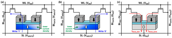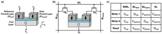 The CPSTT-MRAM uses the spin-transfer torque-based FL switching mechanism, where writing is performed by passing a current through the CPMTJ device. For a write ‘1’ operation, as illustrated in Figure 2c and Figure 3a, BLREF is grounded and VWRITE is applied to SL. Thereafter, the WL is set high to activate both access transistors, enabling the flow of current from SL to BLREF. It should be noted that BLDATA is biased to VWRITE to prevent a current between BLDATA and SL. Then, the FL aligns its magnetization direction parallel to PLREF and antiparallel to PLDATA, resulting in a ‘1’ being stored. A write ‘0’ operation can be performed by setting the relationship between PLDATA and FL to the P state while setting the relationship between PLREF and FL to the AP state. As shown in Figure 2c and Figure 3b, BLDATA is grounded and VWRITE is applied to SL to flow a write current from SL to BLDATA. Then, the FL aligns its magnetization direction parallel to PLDATA and antiparallel to PLREF, leading to the storage of a ‘0’.
