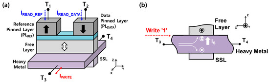 where is the spin-flip length, and are the cross-sectional area of the MTJ and heavy metal, respectively, and is the spin-hall angle of HM, which is defined as the ratio of spin-hall conductivity to electrical conductivity and is used as an indicator to quantitatively confirm the effect of SOT [x1,x2]. In Equation (1), the spin current injection efficiency, which is defined as the ratio of the injected spin current () to charge current (), depends on the cross-sectional area ratio between the MTJ and HM. The appropriate sizing of the cross-sectional area ratio of the MTJ to the HM can result in a spin current injection efficiency above 100% owing to the passage of a single electron through the HM, transferring multiple units of angular momentum [15,17,18]. Therefore, compared to the STT mechanism, the SOT mechanism enables switching operations with higher efficiency. Further, the addition of the SSL to our proposed CPSOT-MRAM device structure significantly reduces the backflow of the spin current. An assumption of a perfect SSL allows us to assume a value of close to zero, making the second term () in Equation (1) negligible. Consequently, the introduction of the SSL further enhances the spin current injection efficiency. The proposed CPSOT-MRAM was implemented using a perpendicular magnetic anisotropy (PMA) MTJ with an external field to break the in-plane symmetry of the magnetization direction.