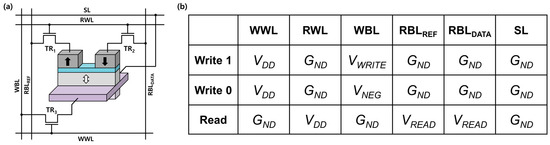 As the HM has two terminals at its ends, resulting in the four-terminal structure (T1~T4) of the CPSOT device, three transistors are required to prevent leakage current. Among these three access transistors, two read transistors (TR1 and TR2) gated by a read word line (RWL) are connected to the two complementary polarized PLs. The read transistors are connected to read BLREF (RBLREF) and read BLDATA (RBLDATA), running in a vertical direction, as shown in Figure 5a. The write transistor (TR3) gated by the write world line (WWL) is connected to one end of the HM. The vertically routed write BL (WBL) is connected to the write transistor, and the opposite terminal of HM is connected to the SL, running in the horizontal direction.